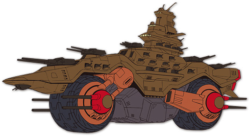 A bike-type battleship that is intended to be used on Earth but is able to function in space as well. The lower portion of the ship has mobile suit decks on either side for launches. An unknown ship of this class is seen operating on the lunar surface in the Crossbone Ghost series.