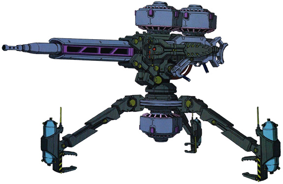 A long-range sniping beam cannon utilized by the Living Dead division. Because the unit itself is equipped with it’s own generator, mobile suits that are incompatible with beam weaponry prior to the Gelgoog can utilize it. The gun barrel has limited use. Because it is fixed with a mobile suit, the crew is shifted at fixed intervals.
