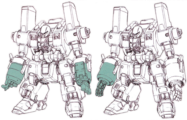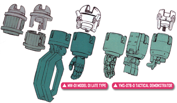 The forearm attachments of the Mobile Worker and the YMS-07B-0 Prototype Gouf Tactical Demonstrator are a common standard so it is possible to exchange the forearm units of each unit. As such, it is structurally feasible to attach the forearm unit of the Mobile Worker to the Tactical Demonstrator. The huge claw on the right hand stands out considerably.