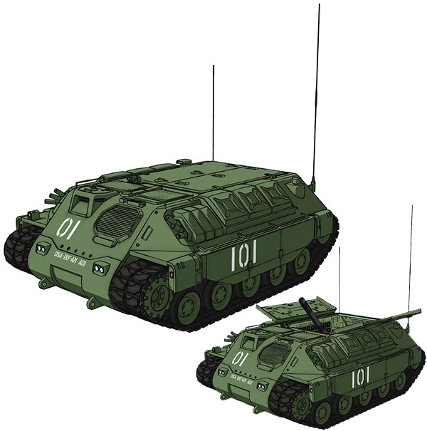 A vehicle deployed by the Autonomous Republic of Zeon. In order to be used by the infantrymen active on the front lines, it became self-propelled artillery in order to move a large-caliber heavy mortar. Since it was based on the body of an armored car, it’s a crawler type that utilizes caterpillars. When deployed, the top hatch unfolds and the stored gun barrel is set up and shelling can be carried out.