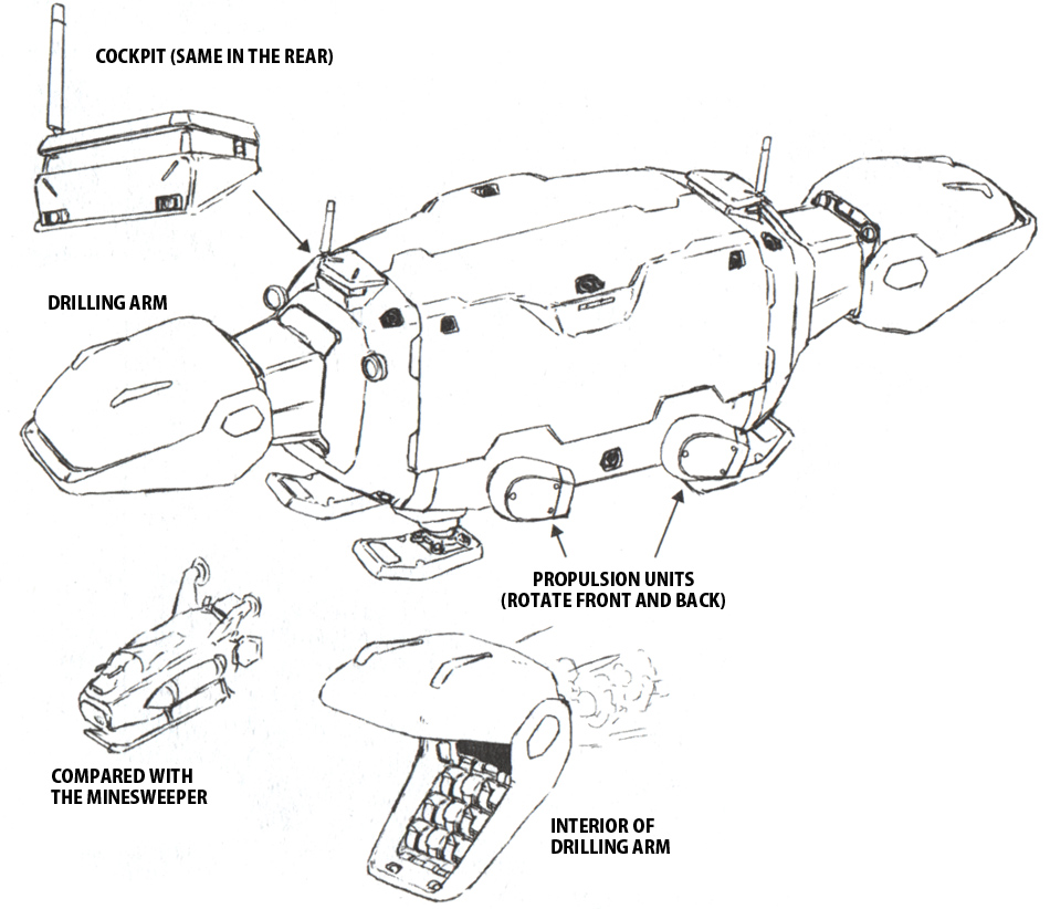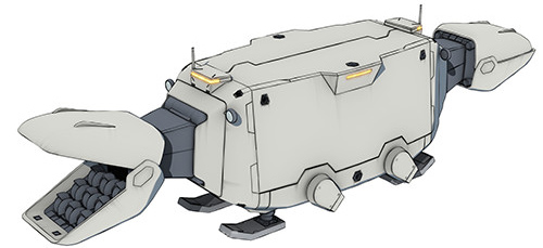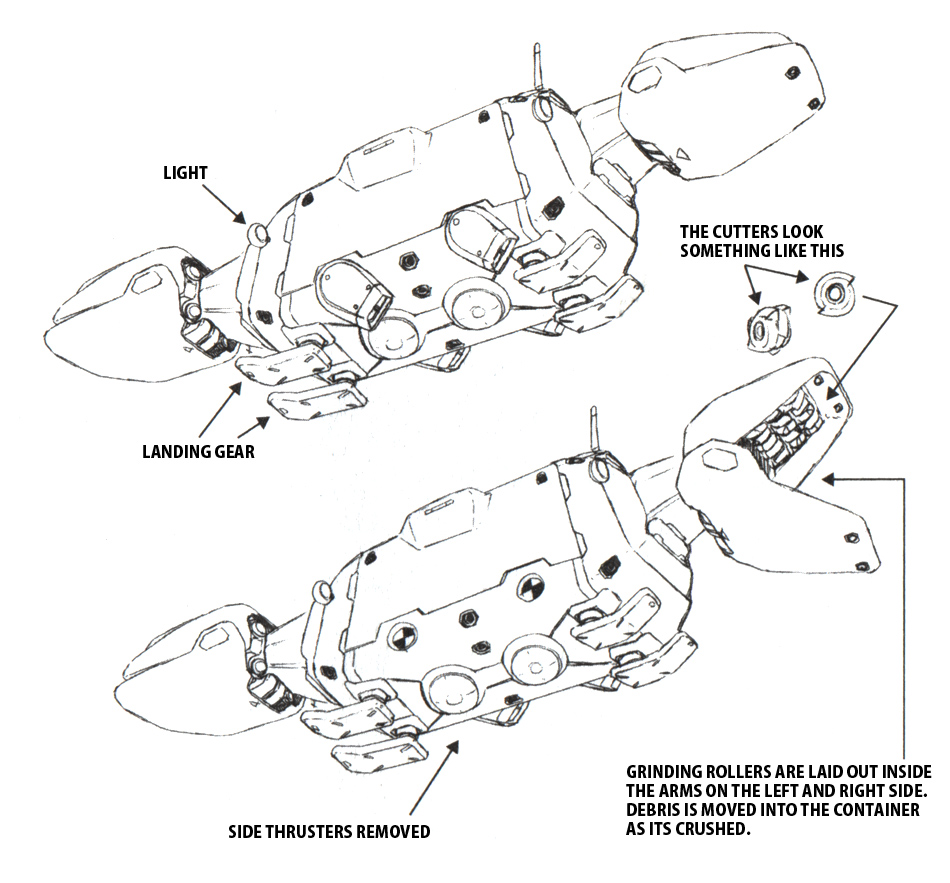 Originally a work vessel for resource extraction on asteroids, it was put to use as a debris collection ship. Equipped with huge arms at the front and rear of its body that have built-in drills, debris enters the tip that is open like a dinosaur’s jaw and crushed smaller by the grinding rollers inside where it’s then collected in a container inside the hull.