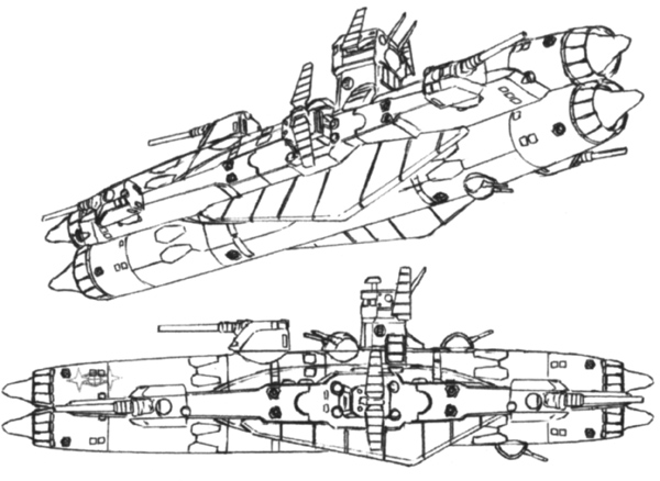 A small ship deployed with the Hatte defense forces on Side 2. Its size is about half that of the Salamis-class and it was used for security missions around the colony taking advantage of its mobility. Propulsion nozzles are mounted at the front and rear of the hull and it is possible to advance and retreat at the same speed. It is equipped with the same machine guns and the like as the Salamis-class.