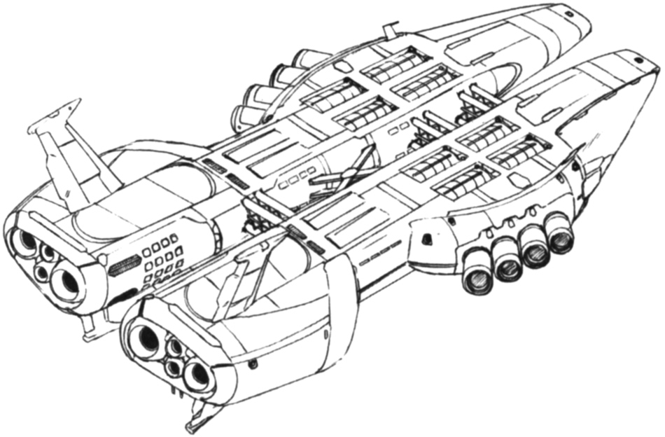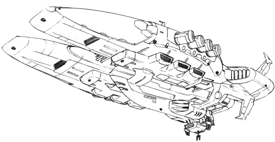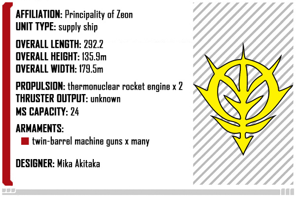 A transport vessel responsible for replenishing supplies for the Zeon forces. In the front of the hull is equipped with tanks loaded with propellant as well as a loading space for the transport of goods. The cylindrical units arranged on both sides of the hull are utilized when carrying goods on to other ships in outer space. A pleated pipe extends from the cylindrical unit and is connected with the ship to be replenished and goods are transported inside. Utilizing its high carrying capacity for the battle of Loum, it was incorporated into the Special Assault Regiment and was assigned the role of a quasi-mothership, transporting a large amount of mobile suits to the battle sector.