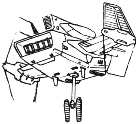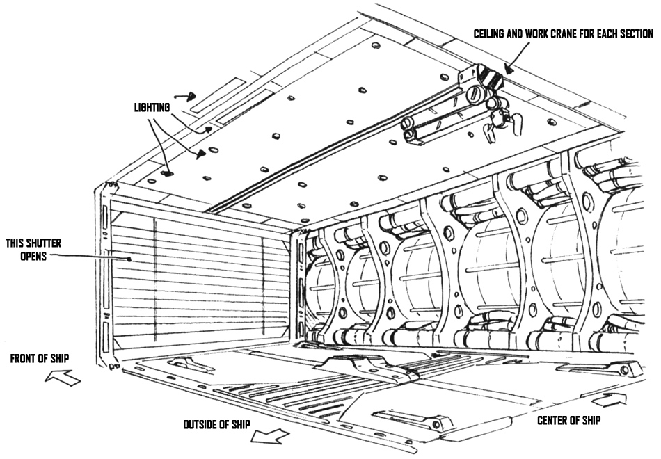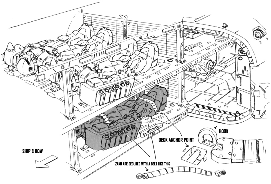 The forward hangar can be divided into an upper and lower layer and further divided into three sections. Two mobile suits are stored in the first section and are secured with a belt during transport. Up to twelve units per side for a total of 24 units in all can be carried. During sortie, the forward hatch on either side opens and the work crane pulls the mobile suits out and they launch.