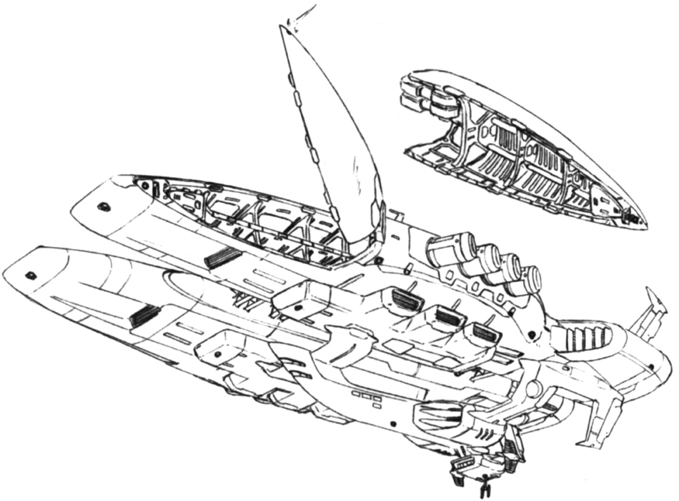 The forward supply loading area on the side of the hull opens to allow for materials to be unloaded. Mobile suits are also stored in this area and are transported to nearby combat areas and launched. The vessel is only equipped with twin-barrel anticraft guns in various places across the hull because the purpose of its use is solely for transport and replenishment.