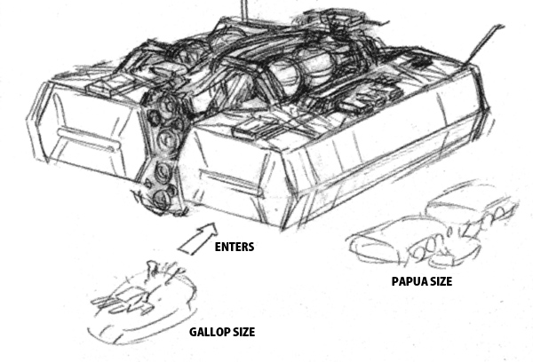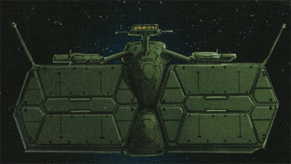 An idea sketch drew early on. Yasuhiko stated that it is a large ship that can hold an entire Gallop land warship in the container. This large, mysterious ship was featured in the avant title of the First Gundam television series. A memorable cut depicted the early stages of battle during the One Year War is now linked with the Origin television series. At the time, there was neither a name nor design work so it was rare for something related to First Gundam to have a nod made. Fumihiro Katagi created the official design version based on Katoki’s sketch above.