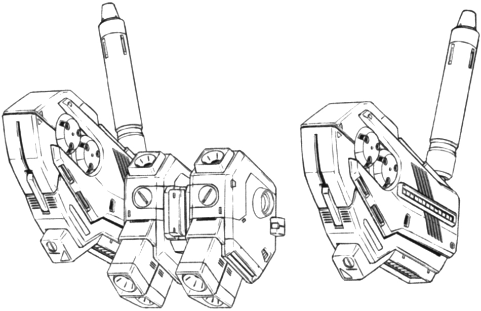 In regards to hand-held weaponry, the same type of beam rifle, new hyper bazooka and hybrid shield as the RX-93-1 was considered, however for the beam saber, it seems to have been replaced by a type that can also be utilized as a beam cannon, which was developed by referencing equipment for the MSZ-010. Other changes included optional equipment to attach to the arm unit. RX-93-1 Prototype Unit 1 had a beam saber rack connected to its left arm, but the RX-94 standardized a beam spray gun mounted on both arms. As for the spare beam saber, it was supposed to be hung on the rear skirt armor, but it seems to be a simple rack that lacks functionality to replenish energy.