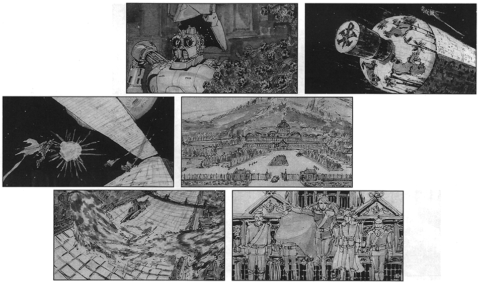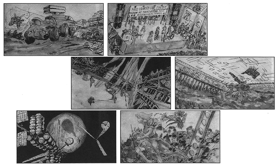 These are storyboards for the film created for the first phase at the end of March 1990. They were redrawn several times following this. I’ve included ones that typically are not seen in the colored reproductions. Hopefully this will help you appreciate and understand the richness behind the world that Tomino was setting out to create.
